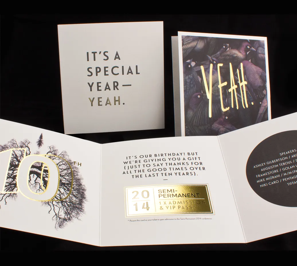 Offset printed 4 colour process and gold foiled, on Mohawk stock.